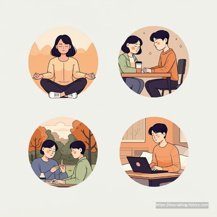 - 호흡 자각하기: 깊고 천천히 숨을 쉬면서 현재 순간에 집중해보세요. 이는 불안한 마음을 진정시키는 데 효과적입니다.