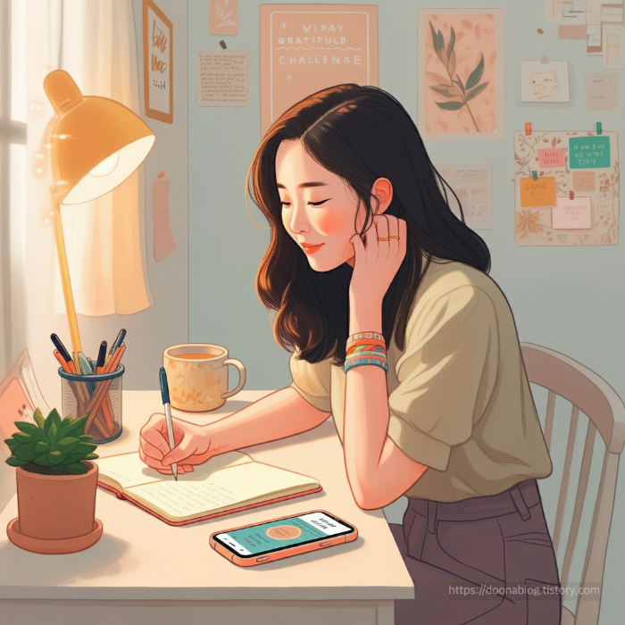 - 감사 연습하기: 매일 밤 그날 있었던 세 가지 감사할 일을 적습니다. 이는 우리의 주의를 긍정적인 면으로 돌리는 데 도움이 됩니다.