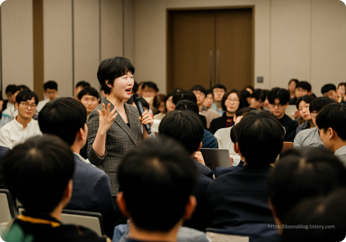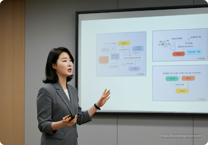 발표 단계에서는 청중의 관심을 사로잡는 의외성 있는 도입이 중요합니다. "여러분은 하루에 몇 번이나 스마트폰을 확인하시나요?"와 같은 질문으로 시작하여 청중의 호기심을 자극할 수 있습니다. 데이터와 스토리를 효과적으로 결합하여 청중이 쉽게 이해하고 기억할 수 있도록 합니다.