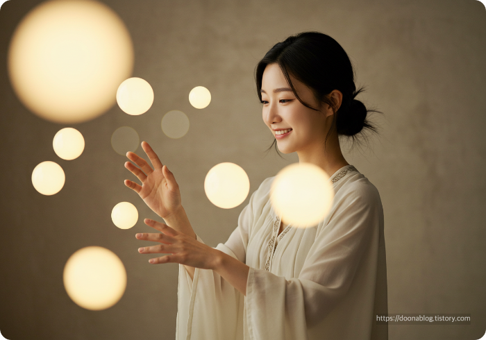 - 수용성: 의도의 보편적 정신이 우리를 이끌도록 맡기고, 변화를 받아들이는 힘. 작은 자아나 계획표에 얽매이지 않고 더 큰 흐름을 수용합니다.