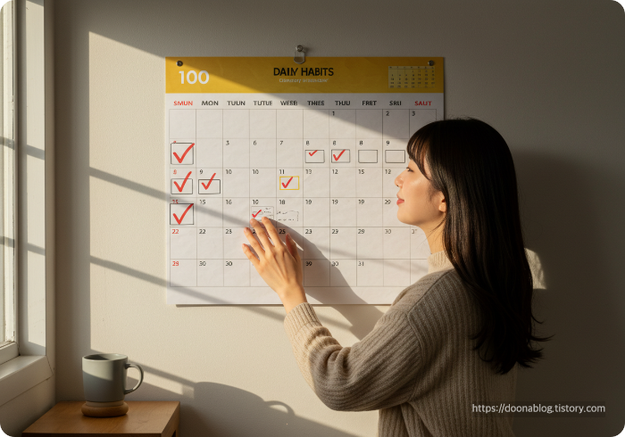 달력에 동그라미를 치거나, 사진을 찍어 SNS에 올리는 등, 사소한 기록은 꾸준함을 '수집'하는 즐거움으로 바꿔줍니다.
