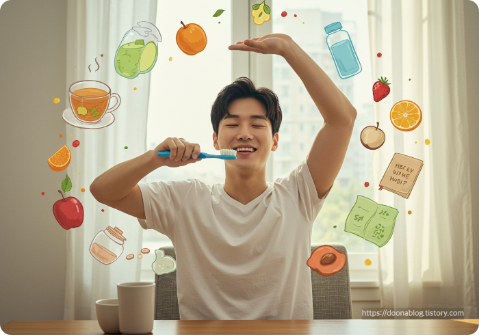 - 아침에 일어나자마자 할 수 있는 아주 작은 일 하나를 정하세요. (예: 물 한 잔 마시기)